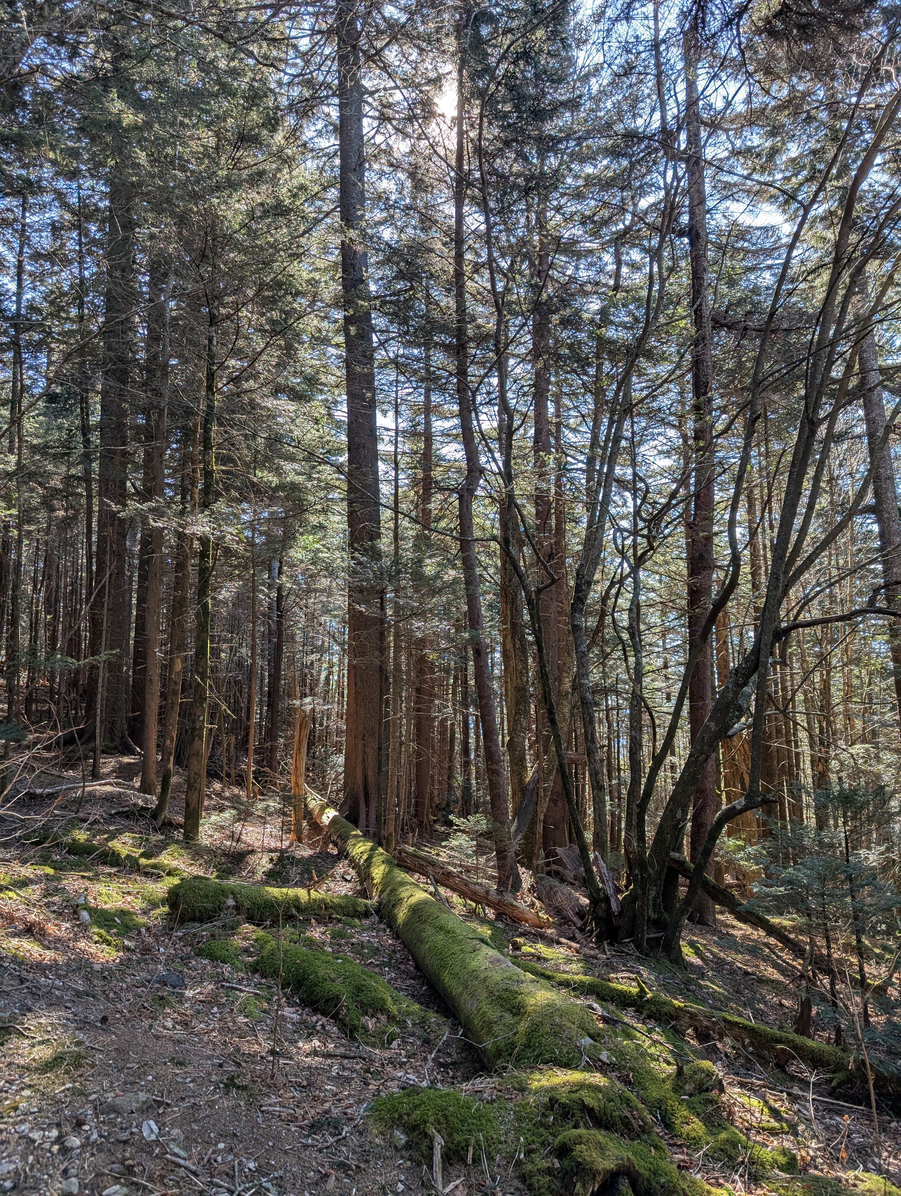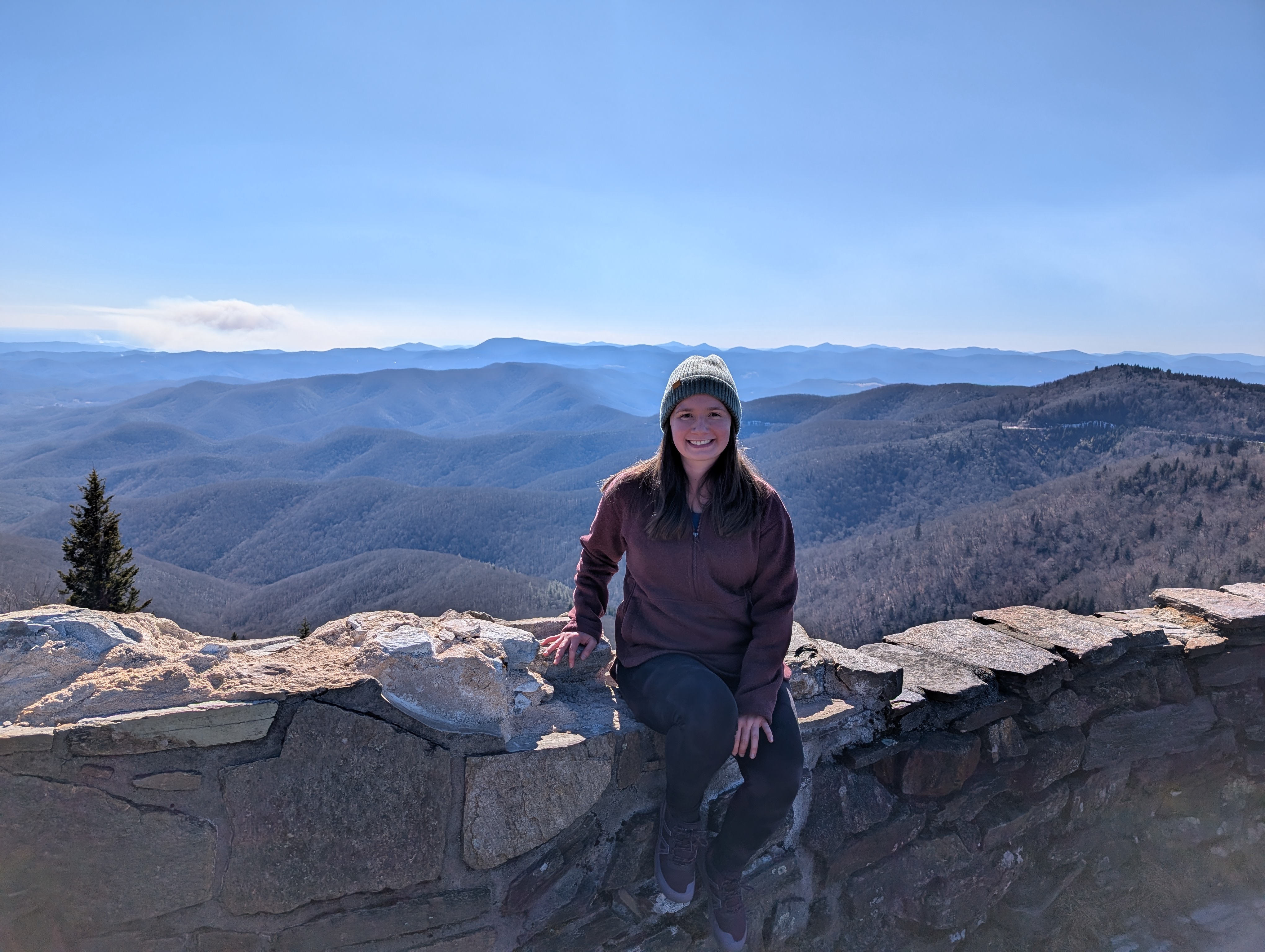 When I got to the Blue Ridge Parkway, the road was closed. Parts of it close during the winter. I parked on the side of the road, as others had done, and started walking up the mountain. I had driven this far already and I wasn’t going home without seeing some beautiful views. As I walked, I ran into a few people coming back down who said there was an overlook and a hike ahead, so I kept going. I am very glad that I did. As I walked, it smelled so good! I’m not an expert at tree scents, but Google says I was probably smelling Fraser Fir and Red Spruce trees. I wish I could have bottled up the scent of the trees. It was so wonderful combined with the crisp winter weather. After walking about a mile, I got to a hike known as the Devil’s Courthouse. It’s just 1 mi long, but it’s steep, with 282 ft of elevation gain. I’m out of shape and it was brutal, but it was so worth it.